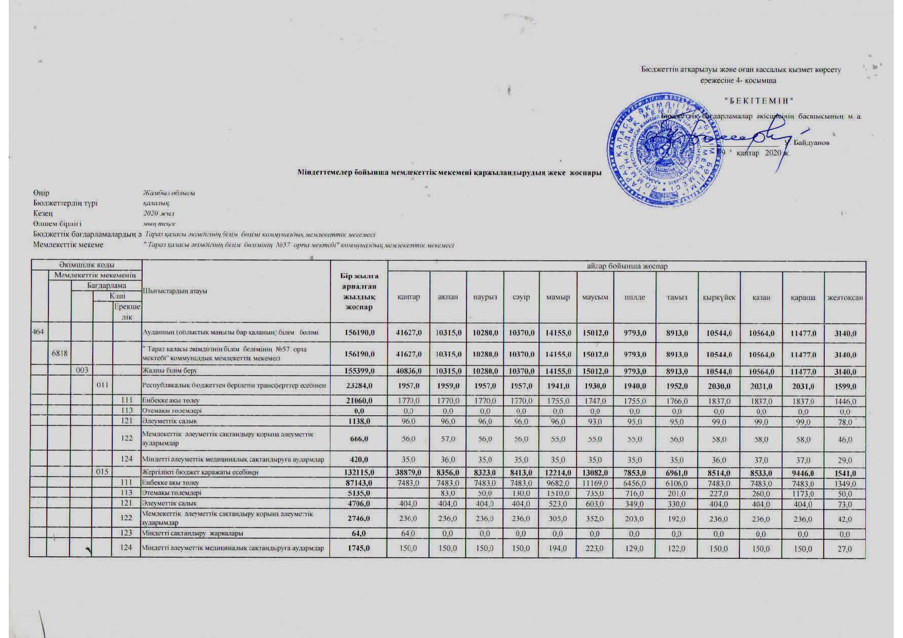 Міндеттемелер бойынша мемлекеттік мекемені қаржыландырудың жеке жоспары » СШ №57
