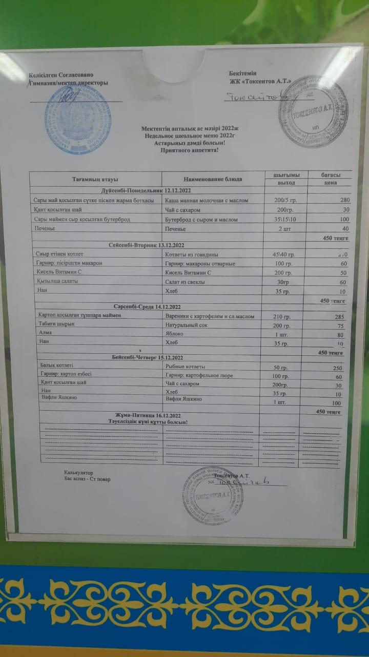 Мектеп асханасындағы оқушылардын тегін тамақтану апталық мәзірі
