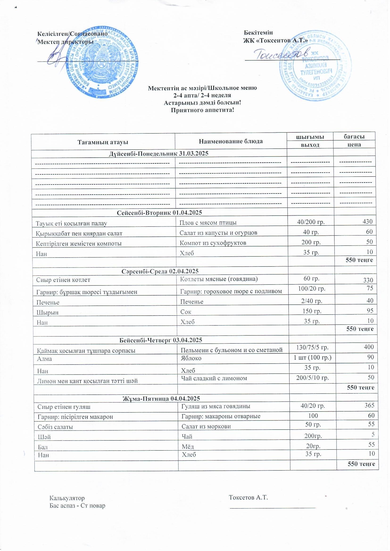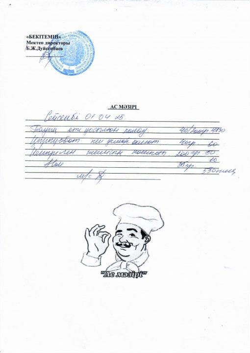 01.04.2025-04.04.2025ж. аралығындағы ас мәзірі