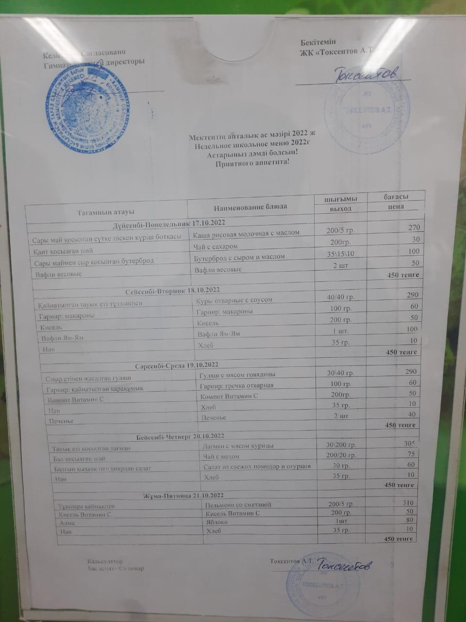 Мектеп асханасындағы оқушылардын тегін тамақтану апталық мәзірі