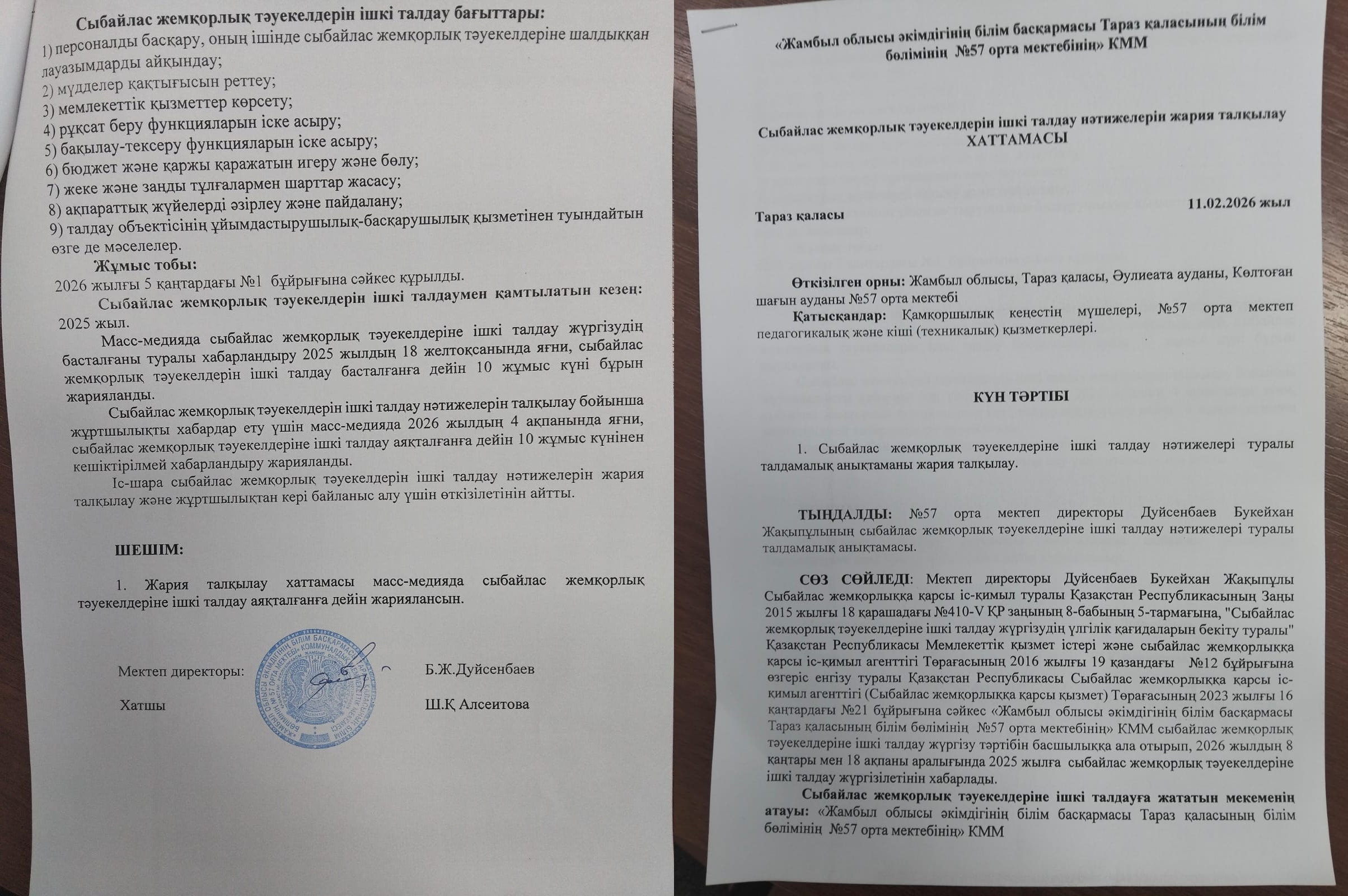 Сыбайлас жемқорлық тәуекелдерін ішкі талдау нәтижелерін жария талқылау ХАТТАМАСЫ » СШ №57