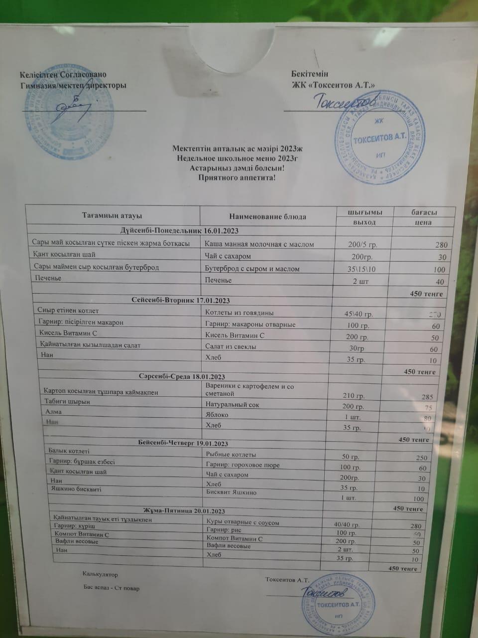 16-20қаңтар аралығындағы тегін ыстық тамақтың менюі » СШ №57