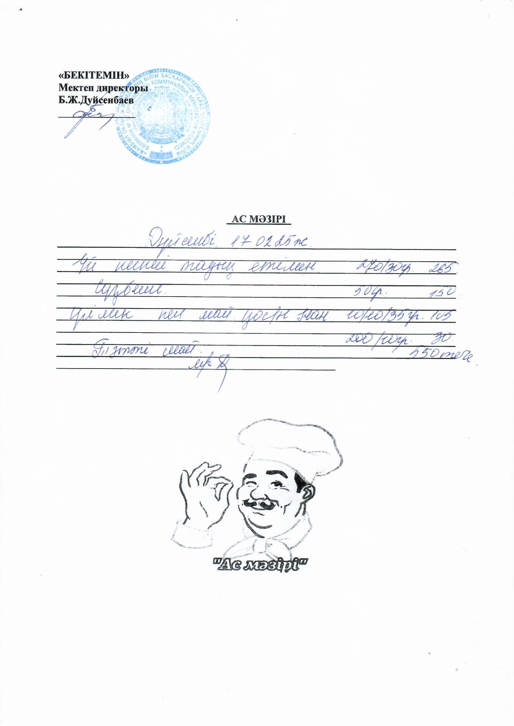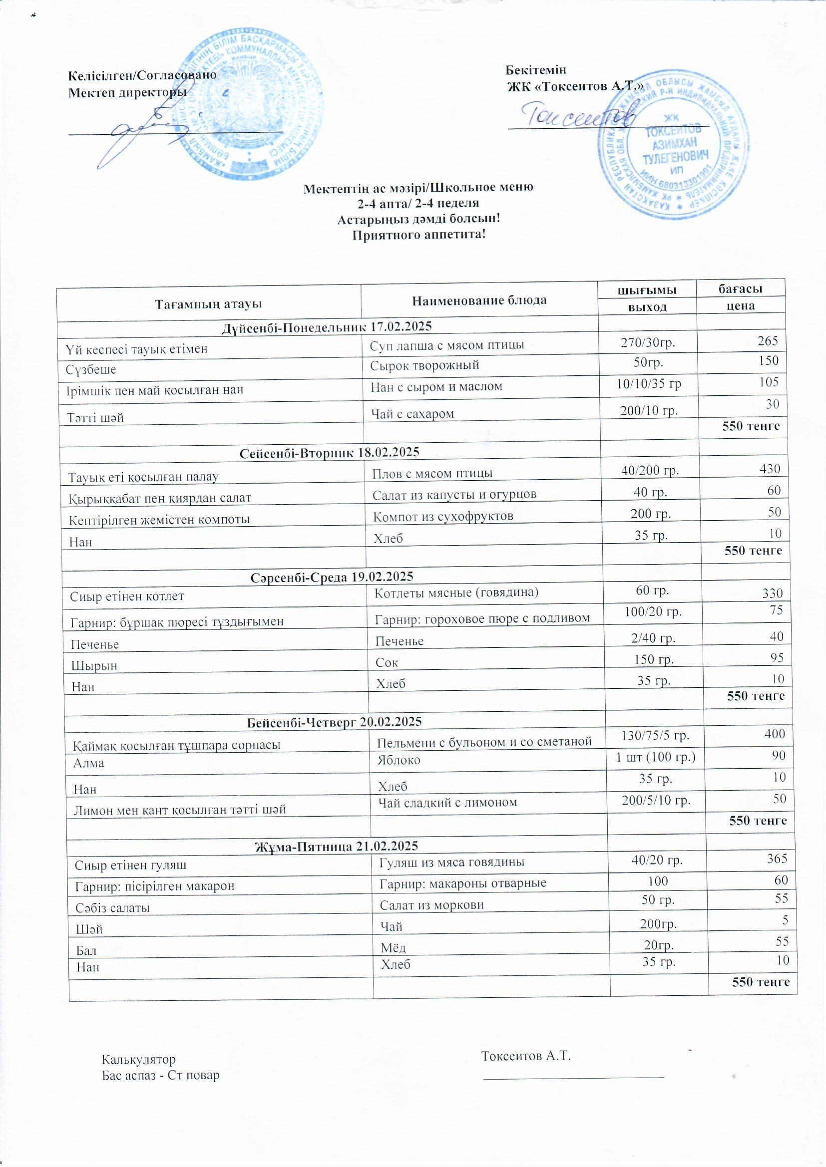 17.02.2025-21.02.2025ж. аралығындағы ас мәзірі